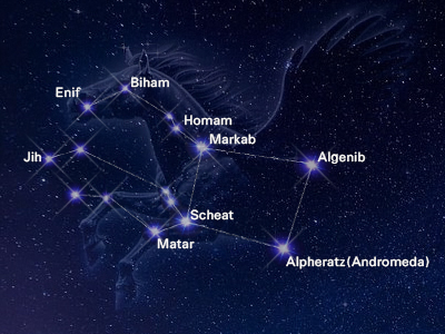αที่สว่างที่สุด(บนคอของม้าตรงทางแยกของปีก) มาหาเราพร้อมกับชื่อภาษาฮีบรูโบราณว่าMarkabซึ่งหมายถึงการกลับมาจากที่ไกล ดาวβ (ที่ไหล่ใกล้) เรียกว่าScheatคือผู้ที่ไปและกลับมา ดาวγ (ที่ปลายปีก) มีชื่อภาษาอาหรับว่าAl Genibซึ่งเป็นผู้อุ้ม ดาวε (ในรูจมูก) เรียกว่าEnif (ภาษาอาหรับ) แปลว่าน้ำ ดาวη (ที่ขาใกล้) เรียกว่า Matar (ภาษาอาหรับ) ซึ่งเป็นผู้ทำให้เกิดการไหล